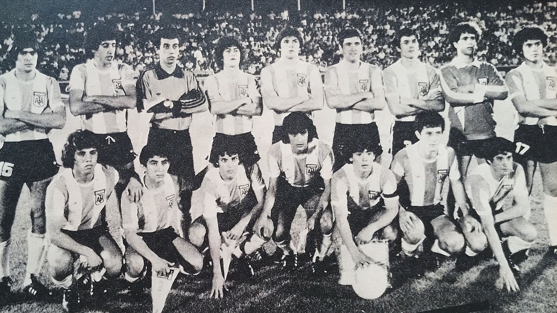 El plantel completo del Mundial 1979: Marcelo Bachino, José Luis Lanao, Sergio García, Abelardo Carabelli, Rubén Rossi, Juan Simón, Jorge Piaggio, Rafal Seria y Juan José Meza. Agachados: Alfredo Torres, Osvaldo Escudero, Osvaldo Rinaldi, Ramón Díaz, Diego Maradona y Gabriel Calderón y Juan Barbas