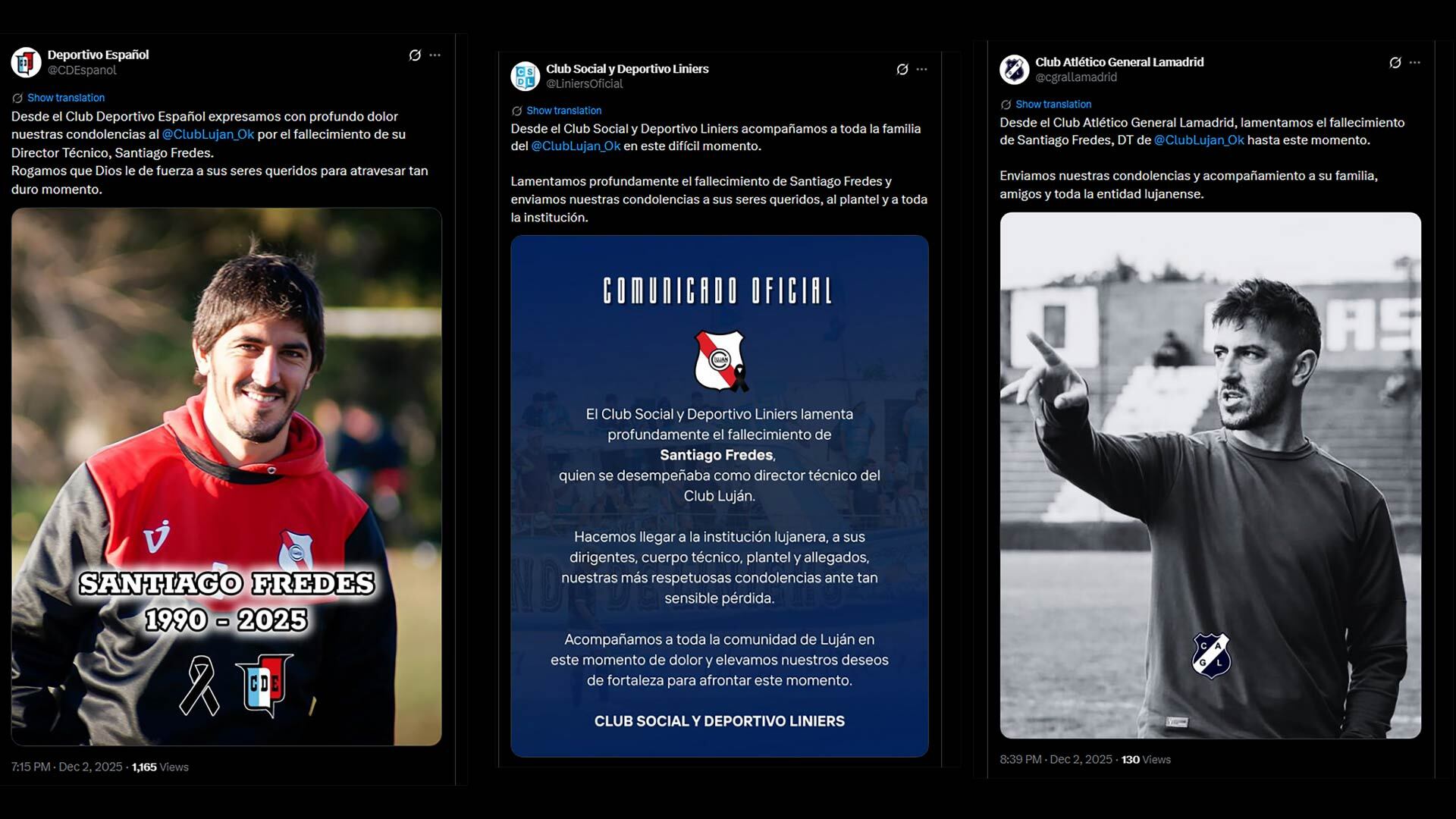 El presidente de la Asociación del Fútbol Argentino (AFA), Claudio Tapia, expresó su pesar en redes sociales, tanto en la publicación del club en Instagram como en su cuenta personal de X. “Qué triste noticia la partida de Santiago Fredes. Mi más sincero pésame y un fuerte abrazo a su familia, amigos y seres queridos. También a todos los integrantes del Club Luján, quienes sin duda sienten profundamente esta pérdida. Que en paz descanses, Pulga“, escribió Tapia, sumándose a las muestras de dolor que se multiplicaron en el ambiente futbolístico.