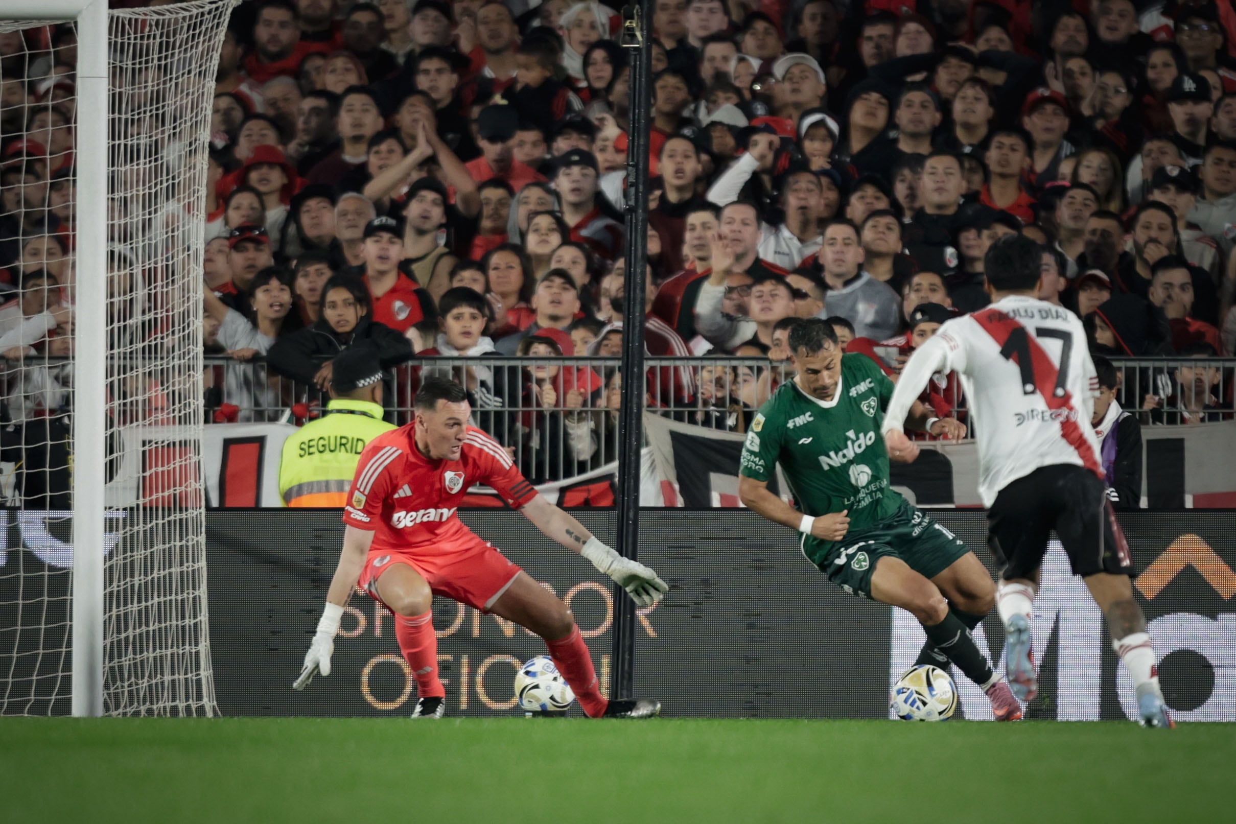 La acción se originó tras una secuencia en la que ambos equipos alternaron la posesión sin lograr imponerse. El lateral izquierdo de Sarmiento, Joel Godoy, intervino anticipando una pelota y, tras controlarla con el abdomen, habilitó al mediocampista central Manuel García. Este último realizó un pase preciso hacia la derecha, donde Alex Vigo —ex jugador de River— avanzó y ejecutó un remate bajo que se desvió. El disparo parecía destinado a salir por la línea de fondo, pero Armani intentó evitar el tiro de esquina y, en su esfuerzo, dejó el balón suelto en el área.