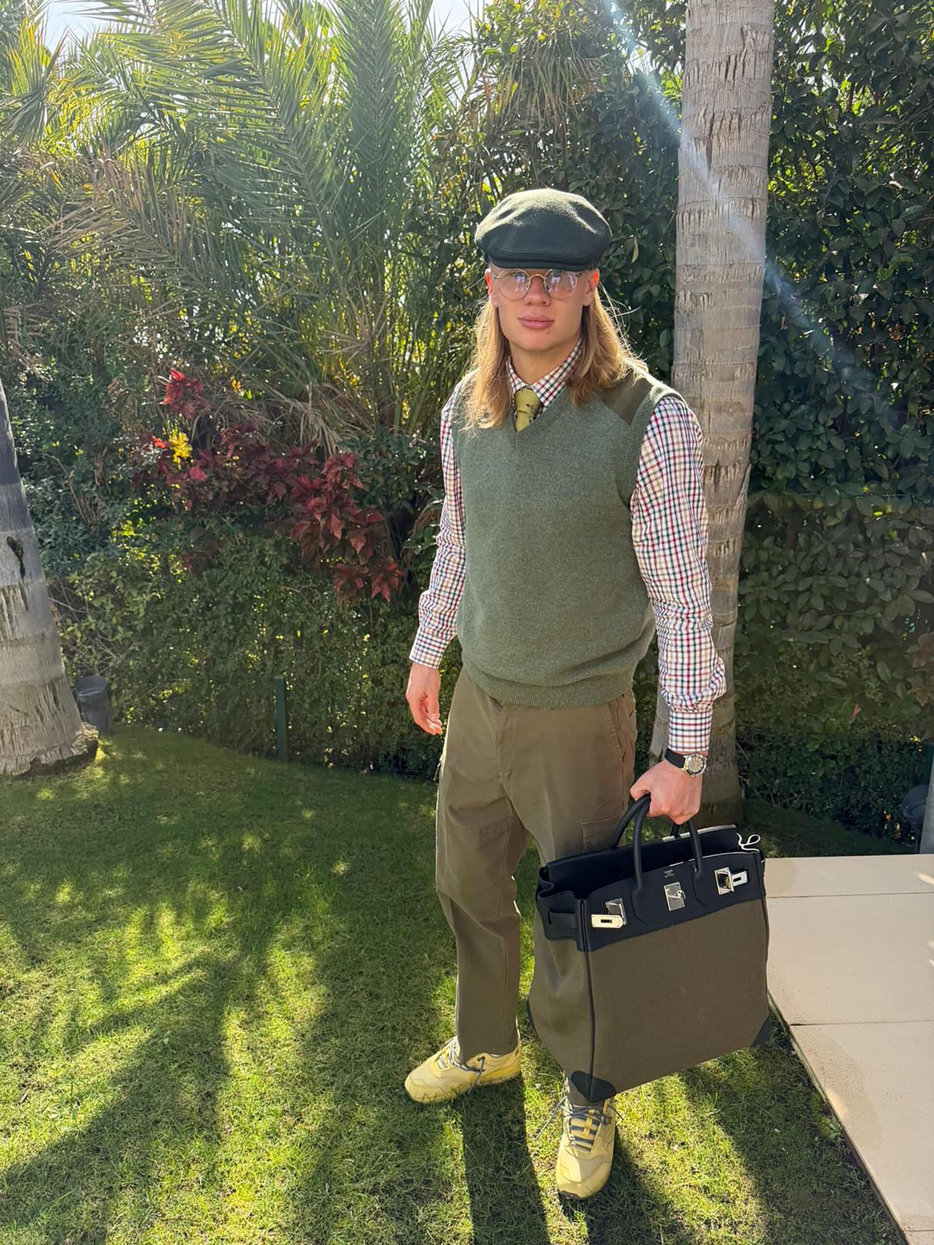 La imagen muestra a Haaland, de 25 años, luciendo un pantalón verde, chaleco a juego, camisa a cuadros, una boina y un bolso de diseño Hermès Hac 40, valorado en 10.900 euros, un accesorio poco habitual en los circuitos de golf. El propio jugador acompañó la fotografía con la palabra “Camos (camuflaje)”, haciendo alusión al tono de su vestimenta.