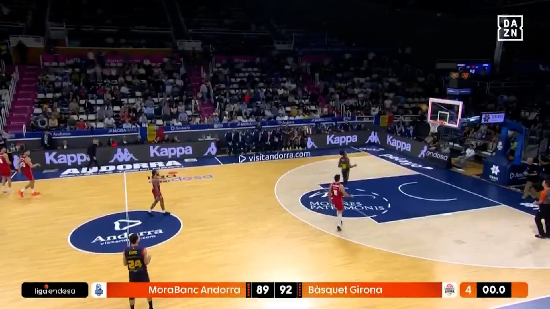 A menos de cinco minutos para el final, dos tiros libres de Luz acercaron a los locales a cinco puntos. El Girona, ya sin Needham en pista, perdió solidez y permitió que el marcador se apretara. Un triple de Pons situó el 82-89 a poco más de un minuto del final, pero el MoraBanc Andorra respondió con un triple de Okoye tras una recuperación de Kuric, dejando el marcador en 89-92. Fue entonces cuando, con solo 1,3 segundos por jugar, Luz recibió el balón tras un saque de fondo y, desde casi la línea de fondo de su pista defensiva, anotó el triple que igualó el partido y desató la euforia en el pabellón. “No es posible” y “esto no es real”, exclamaron los comentaristas tras el increíble disparo de aro a aro.
