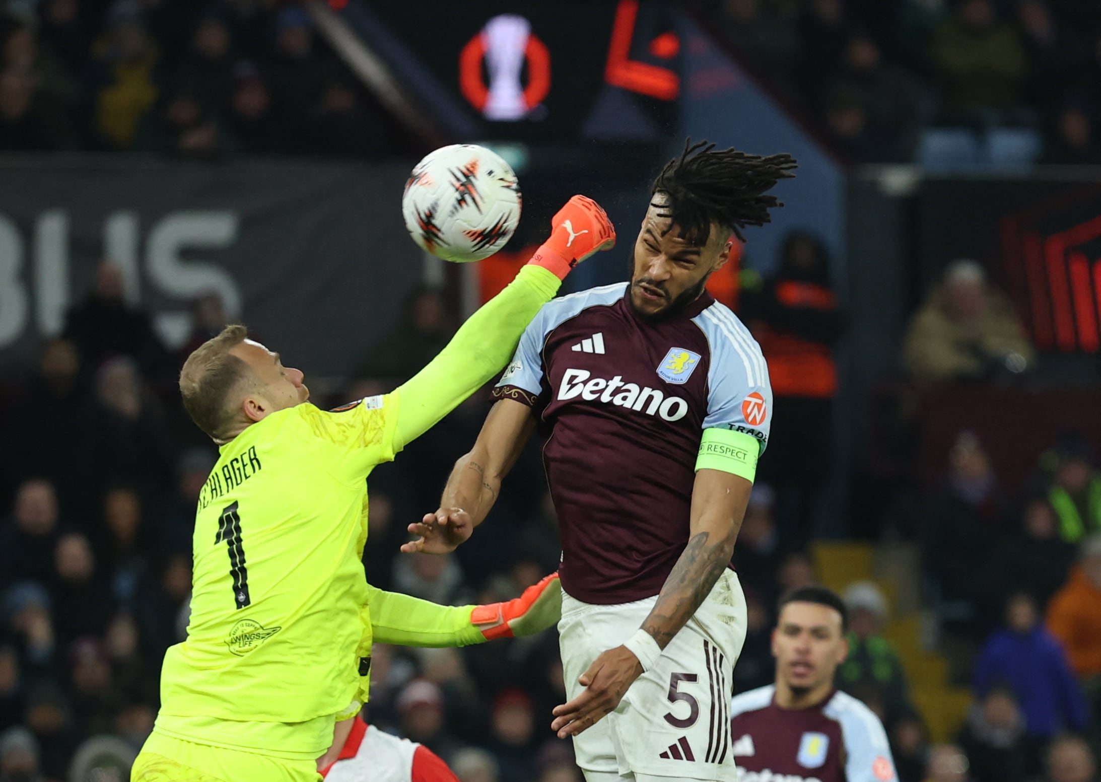 Fue al minuto de juego: Ollie Watkins armó su remate de derecha desde la puerta del área grande y Alexander Schlager no pudo contener en primera instancia, dejando un rebote que fue capturado por el atacante Harvey Elliott. El 9 conectó frente a la zambullida del guardameta austríaco, que se abalanzó hacia adelante con sus brazos tirando un manotazo sin éxito luego de no poder embolsar. el impulso de sus piernas, que se flexionaron en el momento exacto, lo llevaron a bloquear con su taco lo que era el primer tanto del Aston Villa. Emiliano Buendía se apoderó del nuevo rebote, pero la jugada se diluyó.