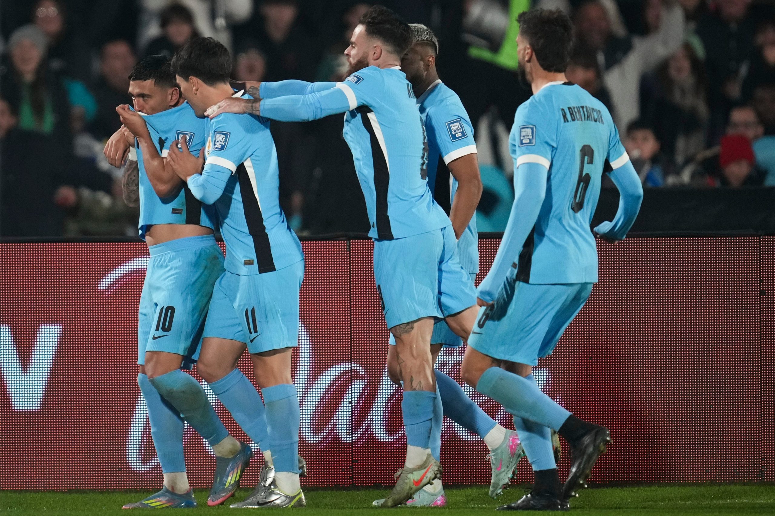 Giorgian de Arrascaeta (izquierda) festeja con sus compañeros de la selección de Uruguay luego de anotar ante Venezuela en el encuentro de la eliminatoria mundialista disputado el martes 10 de junio de 2025 (AP Foto/Matilde Campodonico)