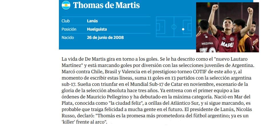 Thomás de Martis, oriundo de Mar del Plata, fue calificado por el presidente de Lanús, Nicolás Russo, como “el prospecto más emocionante del fútbol argentino” y un “killer” (asesino) frente al arco. Este año marcó goles ante Chile, Brasil y Valencia en el torneo COTIF, torneo internacional juvenil disputado en España, alcanzando 11 anotaciones en 13 partidos con la selección argentina Sub 17. “El nuevo Lautaro Martínez”, como lo describen, se entrena con el primer equipo dirigido por Mauricio Pellegrino y ya debutó en la máxima categoría. El atacante persigue el objetivo de participar en el Mundial Sub 17 de Qatar en noviembre, mismo escenario donde la selección mayor se consagró tres temporadas antes.