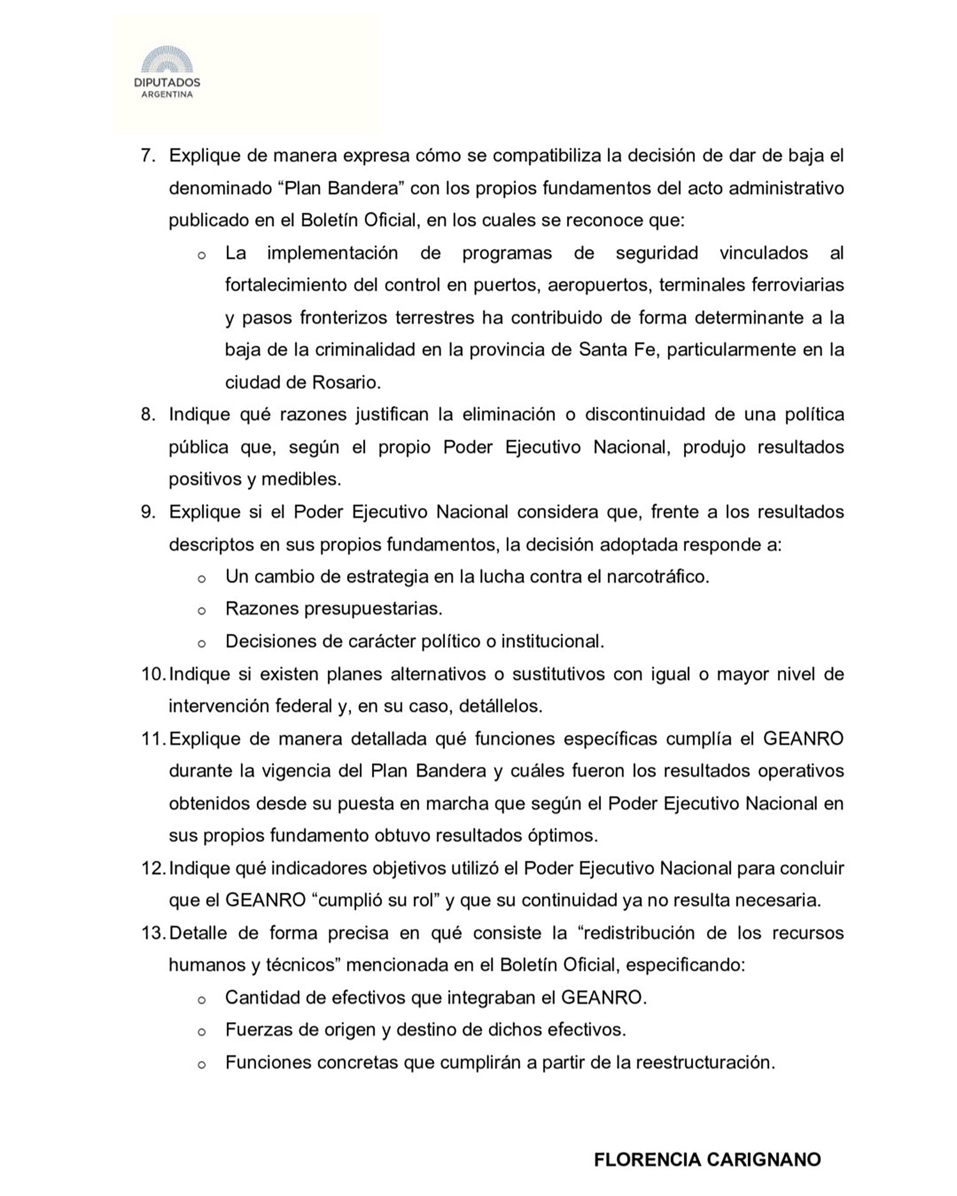 Florencia Carignano presentó un proyecto de resolución en la Cámara de Diputados, en el que solicita información precisa sobre “las razones políticas, operativas y presupuestarias” que motivaron la medida, así como sobre la evaluación de impacto previa, los dispositivos y recursos que reemplazarán al GEANRO, y la coordinación con el gobierno provincial.