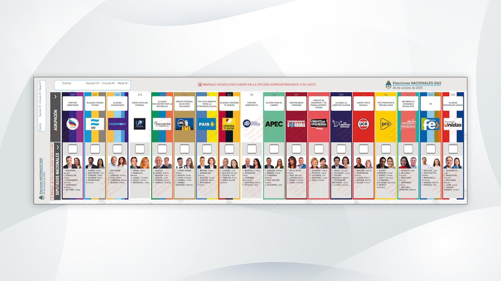 En la boleta que se utilizará en Córdoba, estarán una al lado de la otra las 18 fuerzas que competirán por las 9 bancas en la Cámara de Diputados.