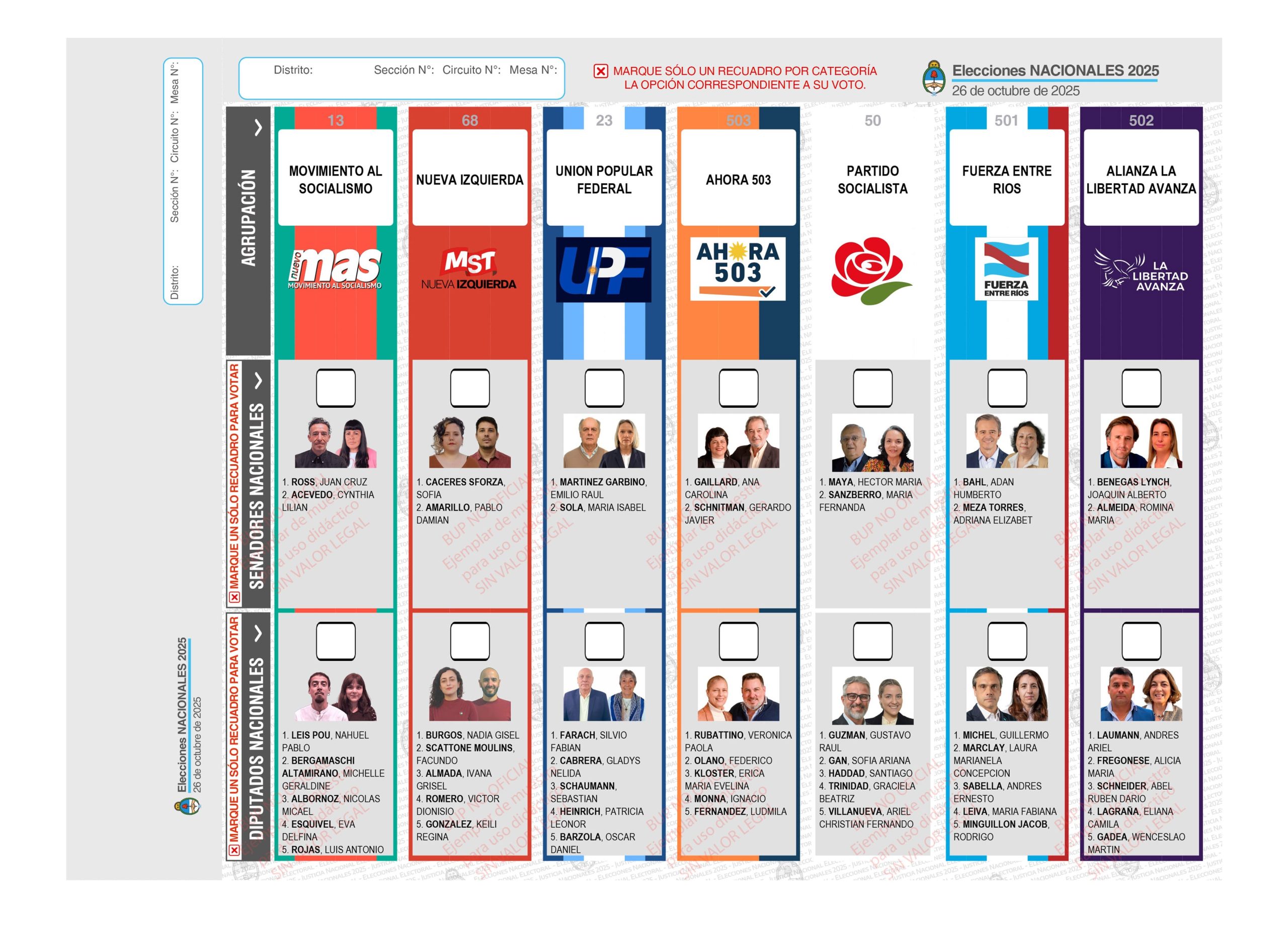 Una vez en el lugar de votación y mostrar la documentación requerida, el ciudadano recibe de las autoridades de mesa una sola boleta oficial correspondiente a su distrito y categoría. Esta boleta contiene organizadas las nueve listas oficializadas por la Cámara Nacional Electoral para Entre Ríos, permitiendo que el votante visualice todas las alternativas para diputados y senadores nacionales.