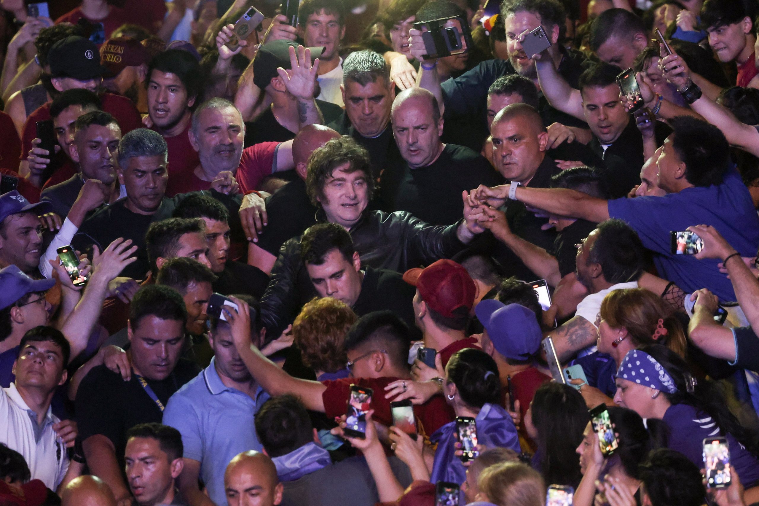 Javier Milei ingresando al acto entre la militancia (REUTERS)
