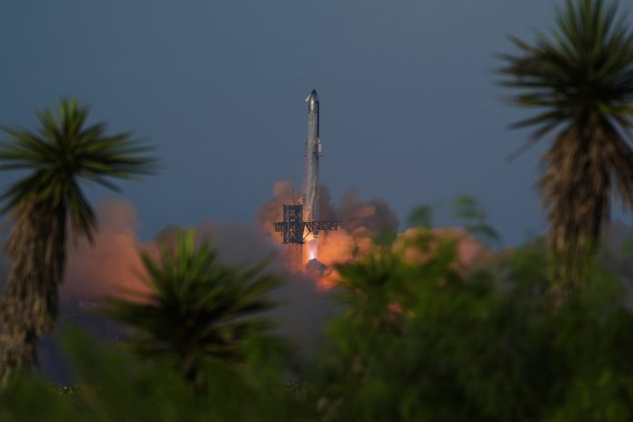 El cohete Starship de SpaceX despega para un vuelo de prueba el martes 26 de agosto de 2025, en Starbase, Texas. (AP Foto/Eric Gay)
