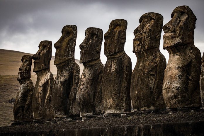 Esta imagen representa las icónicas estatuas de piedra de la Isla de Pascua, símbolo de la cultura Rapa Nui que evoca misterio y sabiduría ancestral. Su diseño muestra una cabeza grande de piedra gris con nariz prominente y mirada estoica, a menudo mirando a la izquierda.